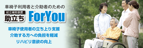 | 概要 | 「介護者の腰痛に困ってはいませんか?」高齢者や障害を持つ人など、車椅子を使用する人とそれを介助する人の双方の助けになるのが、車椅子起立補助装置「助立ちFor You」です。 | ||