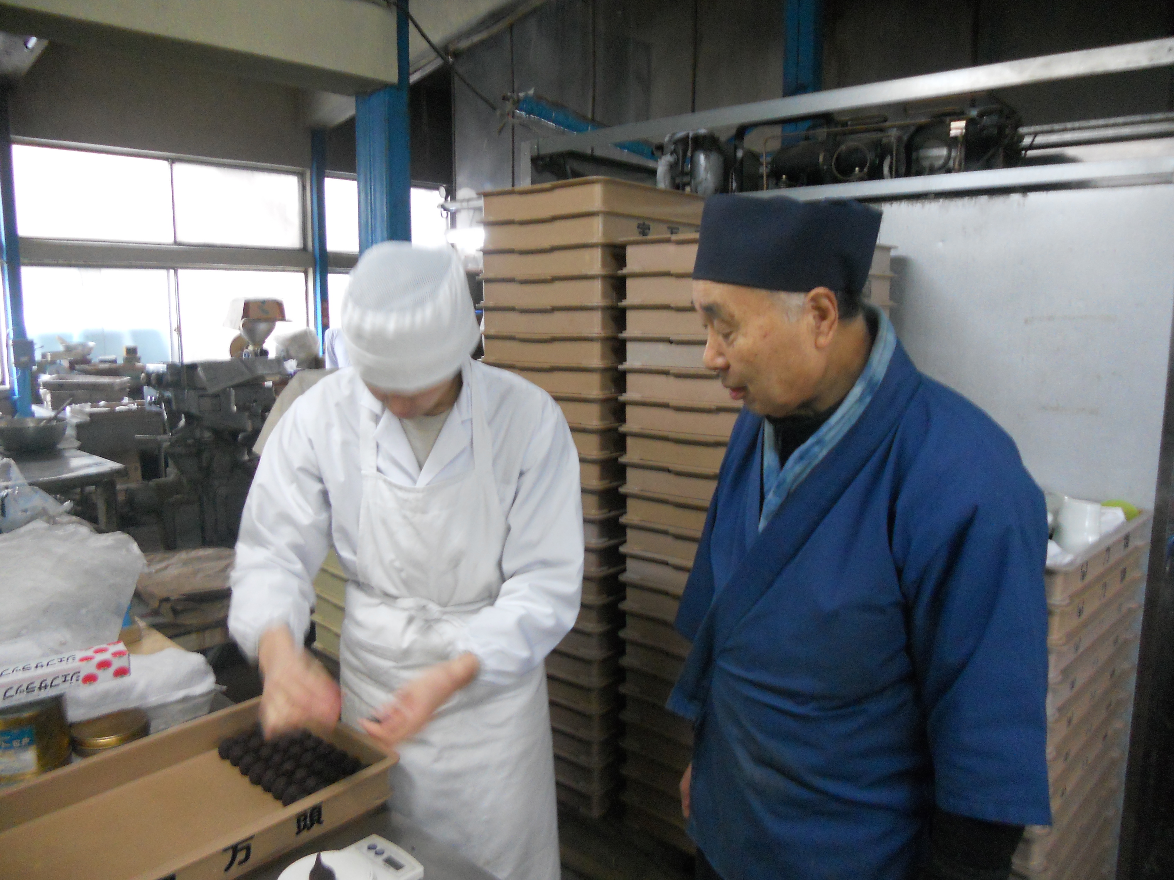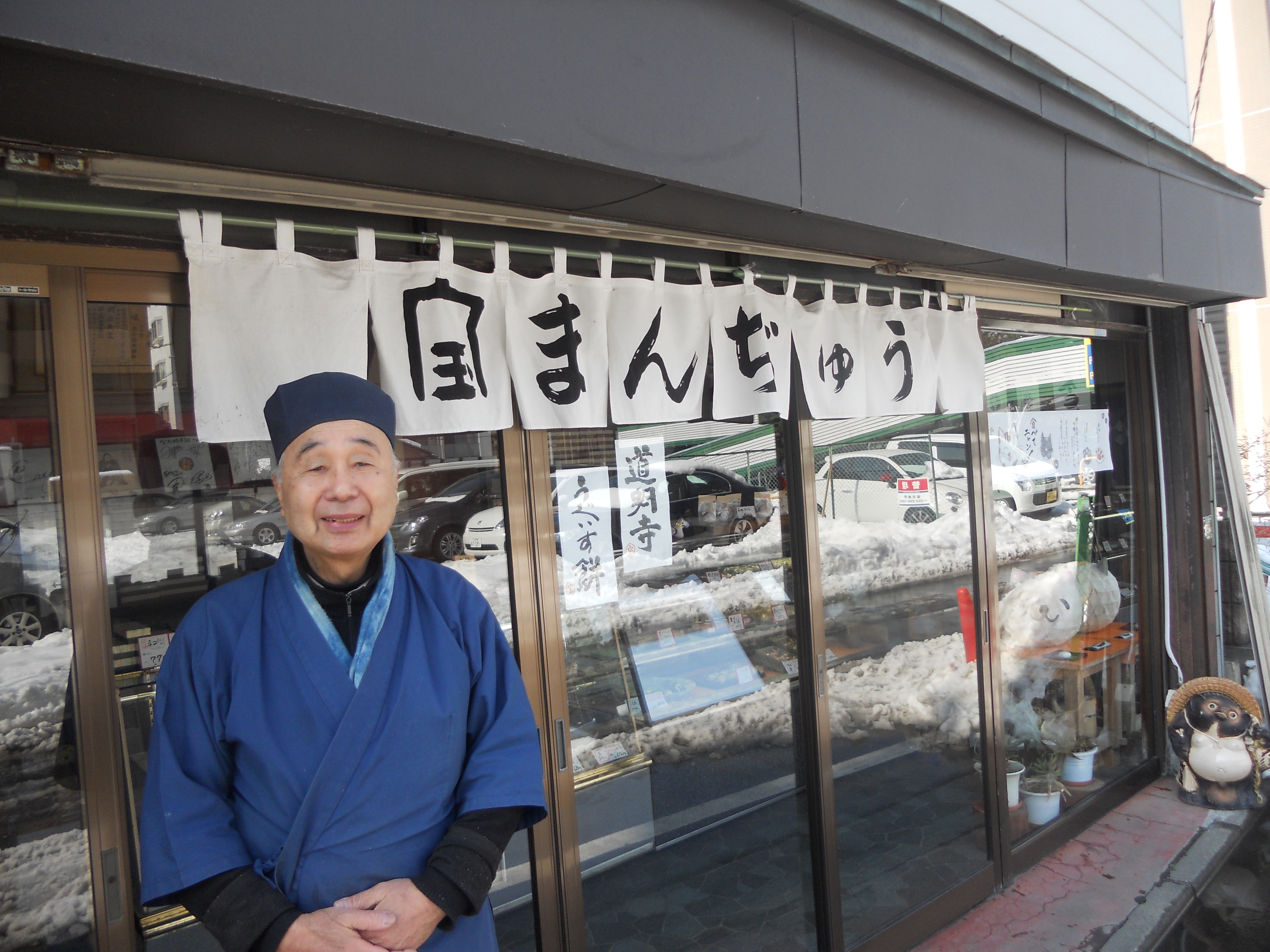 「ネコまん」誕生秘話 「宝万頭(まんじゅう)」を知る仙台の人は多い。あの黒砂糖生地の薄い皮に包まれた餡入りの万頭だ。昭和30年に開業した「宝万頭本舗」の創始者は崎野光明(さきのみつあき)さん(75歳)。未だ戦後の復興が済んでいない仙台市上杉(かみすぎ)町の一角に小さな工場を建て、菓子作りを始めた。甘いものがまだ充分取れなかった時代、この菓子工場から生まれた「宝万頭」はたちまち仙台中の話題となり、お土産に、お使い物にと、仙台を代表するお菓子に成長した。 崎野さんの菓子作りに対する人一倍の情熱がヒット商品を生んだ背景にはあるが、物を作る原点となる〝人のために〟の精神に貫かれているのが、崎野さんの物作りの基本を為すものだ。それは商品に留まらず、工場で働く従業員採用にも現れている。行政は障害者雇用を企業・団体にも求めているが、「宝万頭本舗」ではいち早く採用方針に取り入れている。 平成10年、軌道に乗った会社を長男・敬光(のりみつ)さんに譲り、崎野さんは仙台市荒浜にできた障害者授産施設「円(まどか)」の技術指導員の仕事に就く。それまで培ってきた菓子作りの技術を施設で働く障害者のためにという、崎野流人生哲学の為せる業だ。 「円」で作られる昔ながらの万頭や〝がんづき〟(蒸し菓子)は地域の人たちに喜ばれ、口伝えで広まったお菓子は、それを求めて周辺の町からもお客が来るようになった。しかし、それで満足するような崎野さんではなかった。「何か新しいものを.」探究心の強い崎野さんは、ある時、〝ハマボウフウ〟という海浜植物が土地の人たちの季節の食べ物になっていたことを知り、早速、生産者に連絡した。ハマボウフウによる海岸の美化と畑での生産に努めていた「名取ハマボウフウの会」は、崎野さんの要請を受けてその食材を施設に提供することを約した。 〝ボウフウおこわ〟が「円」で発売されるようになったのは、それから間もなくのことだった。独特の芳香を持つハマボウフウのだし汁を使って蒸し上げる一パック三百円の〝ボウフウおこわ〟は評判となり、「円」のヒット商品の一つになった。 そんな時、東日本大震災は起きた。「円」も大きな被害を受け、施設は使用不能となった。全てが振り出しに戻った。崎野さんは、幸い被害の少なかった仙台の「宝万頭本舗」に戻り、長男の敬光社長を助けて社業の継続に尽力した。そして、どんな苦境に立たされても、新商品開発への意欲は弱まることは無かった。そのような状況の中から生まれたのが〝ネコまん〟だ。丸い形の万頭の表面に、ネコの肉球を思わせる焼印を入れた遊び心たっぷりの商品だ。機械を使わず全て手作りの〝ネコまん〟は、餡の練り具合から生地の包み加減、そして、肉球の茶色の部分は、黒糖生地を一枚一枚貼っていくという、実に手間ひまのかかる商品なのだ。しかし、ほのぼのとした形と思わず笑みがこぼれるこのユニークなお菓子は、ネコ好きな人や若い女性の心を捉えリピーターも多い。 「人生、楽しくいきましょうや!めげててもしょうがないんだから。」